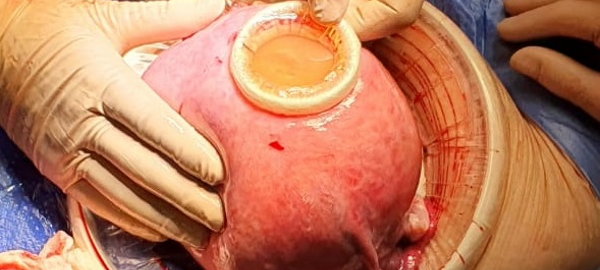Luego de reparada la lesión de la columna fetal, se procede a la extracción del anillo retractor de la pared uterina...