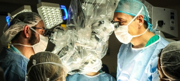 Una vez expuesta la lesión de la columna fetal por el Ginecoobstetra, los neurocirujanos proceden bajo visión microscópica a...